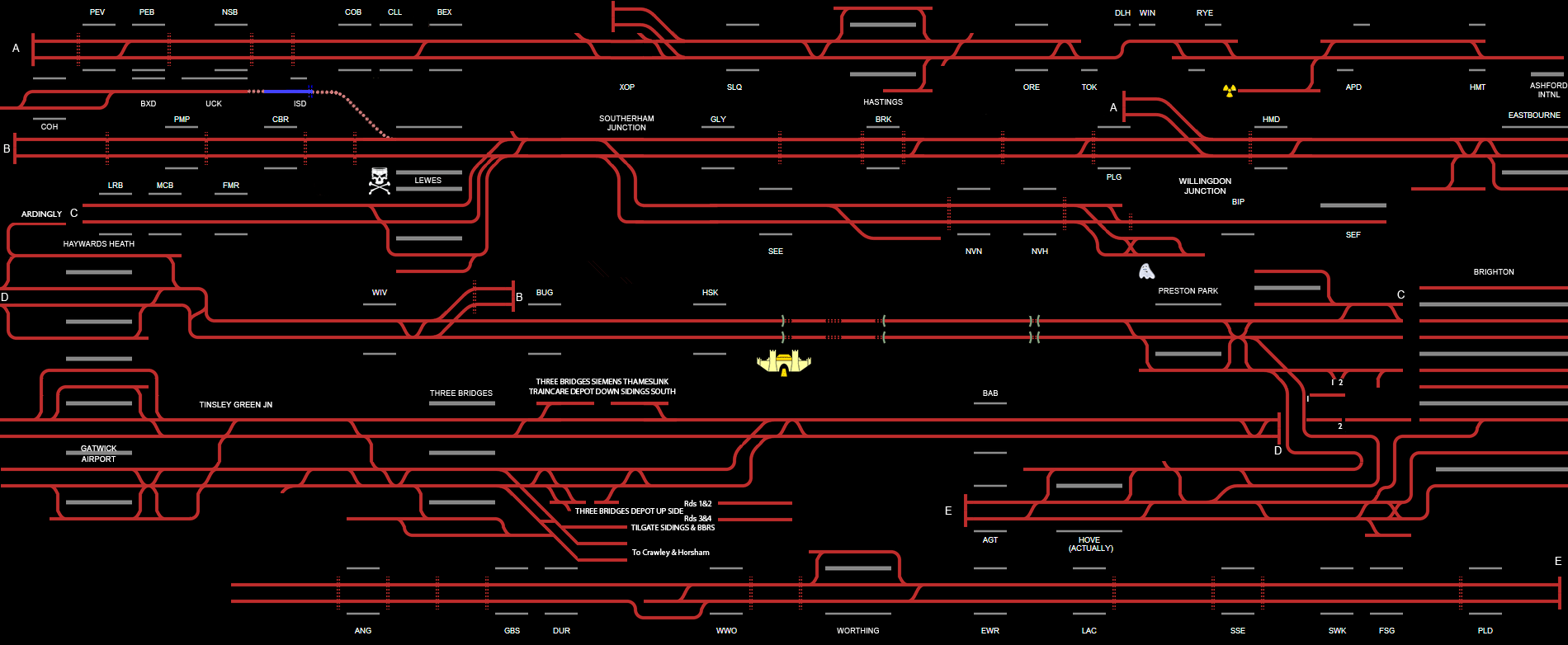 KEY: Level Crossings: U=UP, D=DOWN (blank neither), C=CROSSING CLEAR, $ $ Red Road Lights, F=FAILED, L=LOCAL CONTROL ACTIVE. Points: (=NORMAL, )=REVERSE. Routes: *=ROUTE SET. Other: )=RELEASE